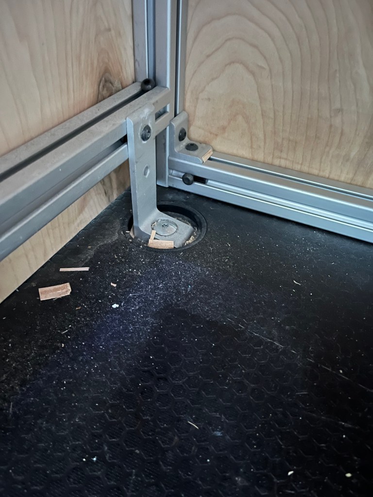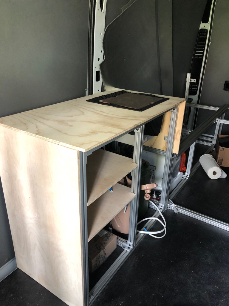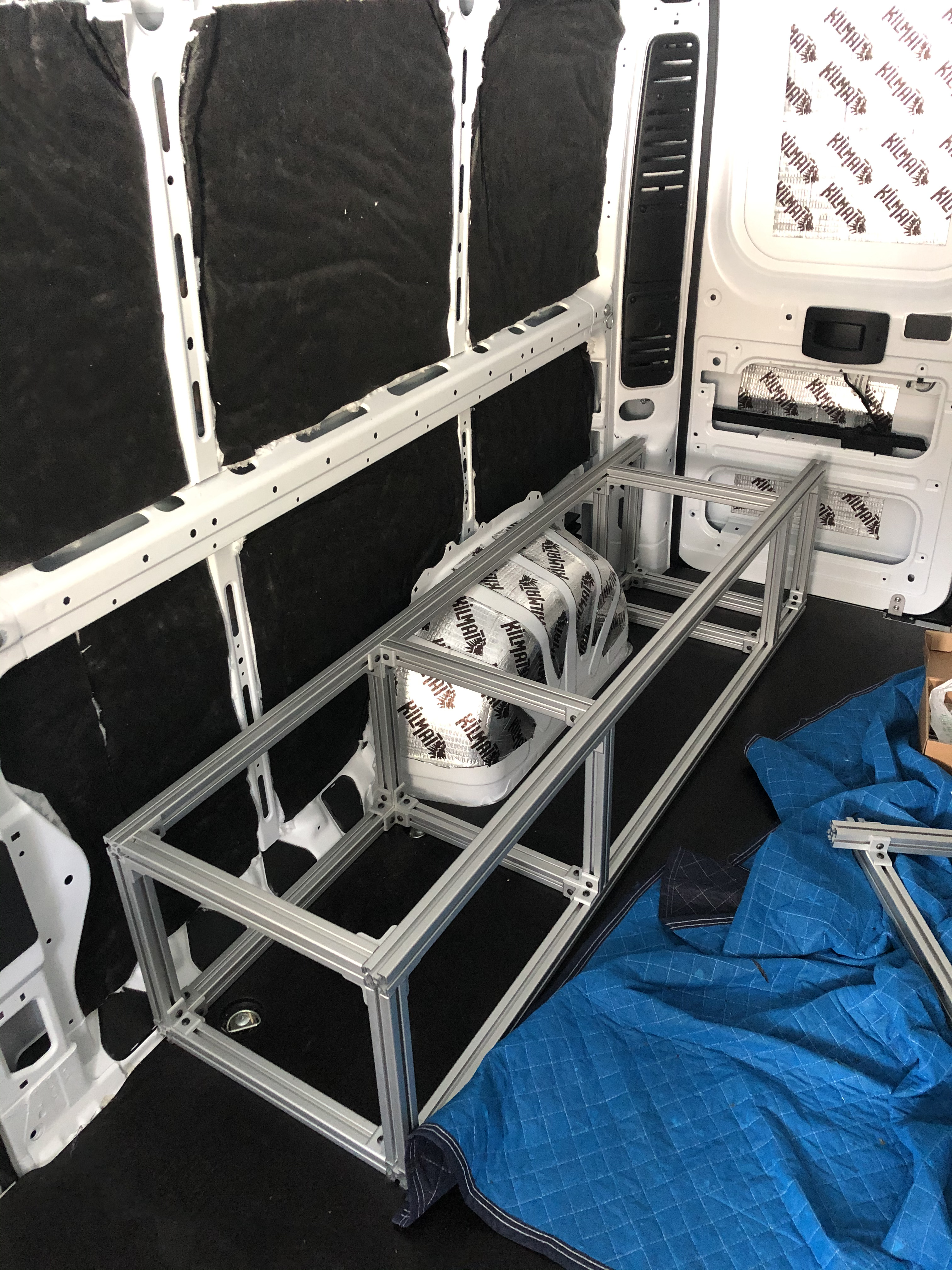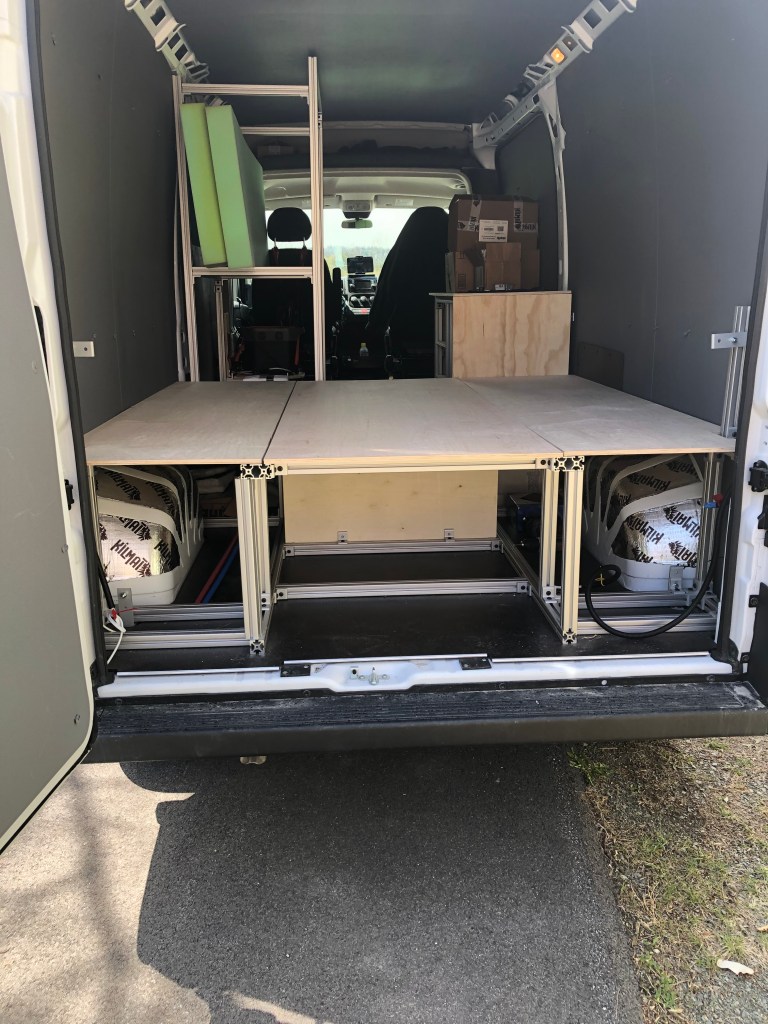 Shabazan has 3/4 plywood covering the bed area (6’x6′). All other sheets are 1/2″ or 1/4″ to reduce weight. As a building tip: add a thin strip of foam between the extrusion and the plywood to eliminate vibration noise.
