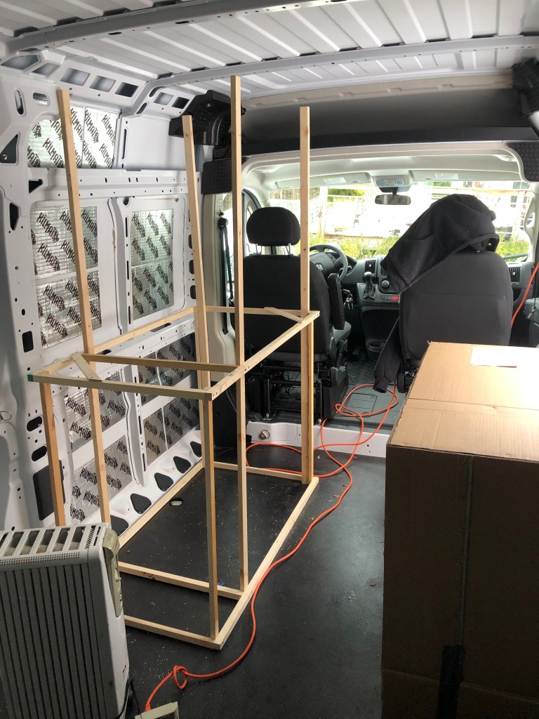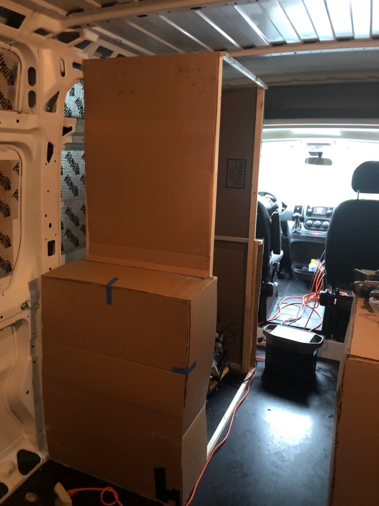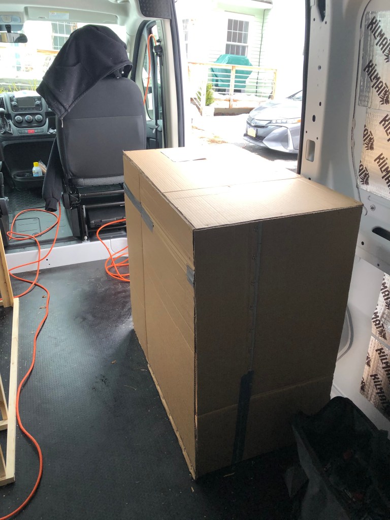 I first built sample fames using 1.5″ wood, then covered them with cardboard or brown paper sheets to get a feel of how everything would look. The original design had a counter to the left of the wetroom. I shifted the room back to leave more space behind the driver. This space became the fridge & power center.