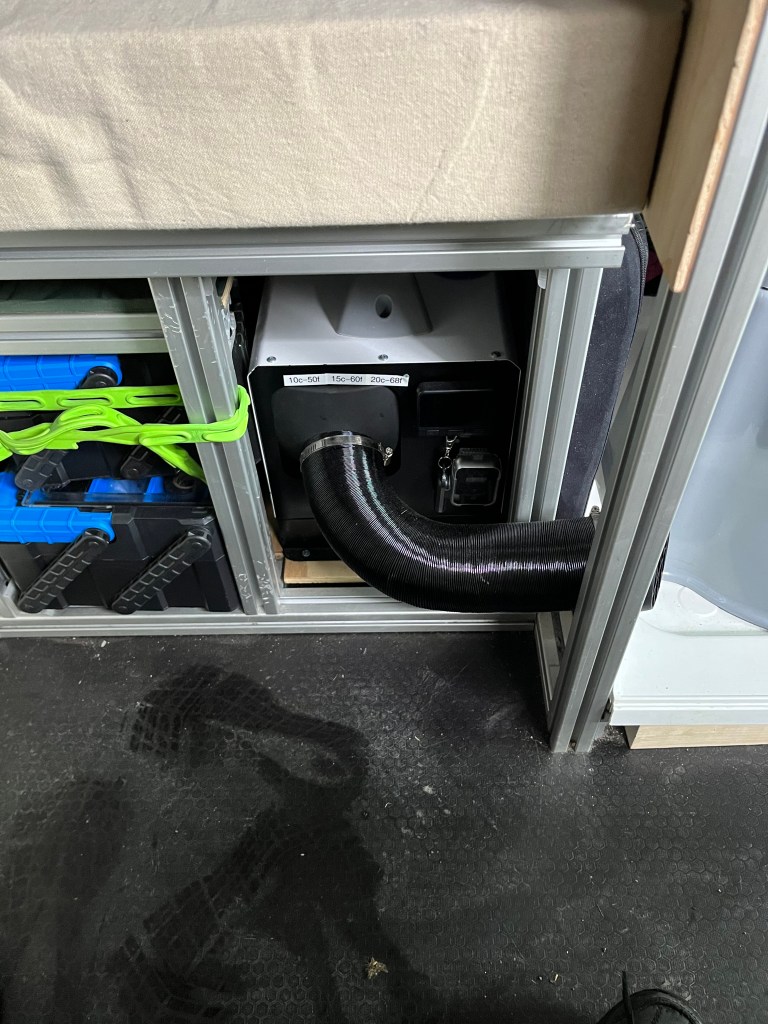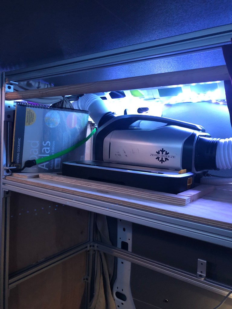 I also have a true compressor AC system from ZeroBreeze that is permanently mounted in the shelf over the wet room. The BTU is not great but it is sufficient to cool off the bed area, which is 6’x6′ and about 4′ of airspace. I do draw a curtain at night to preserve the cooling zone. The ElecHive power station, also from ZeroBreeze outputs the 24v power needed. And at 2500 Watt/hour it can run the AC all night with plenty left to spare.