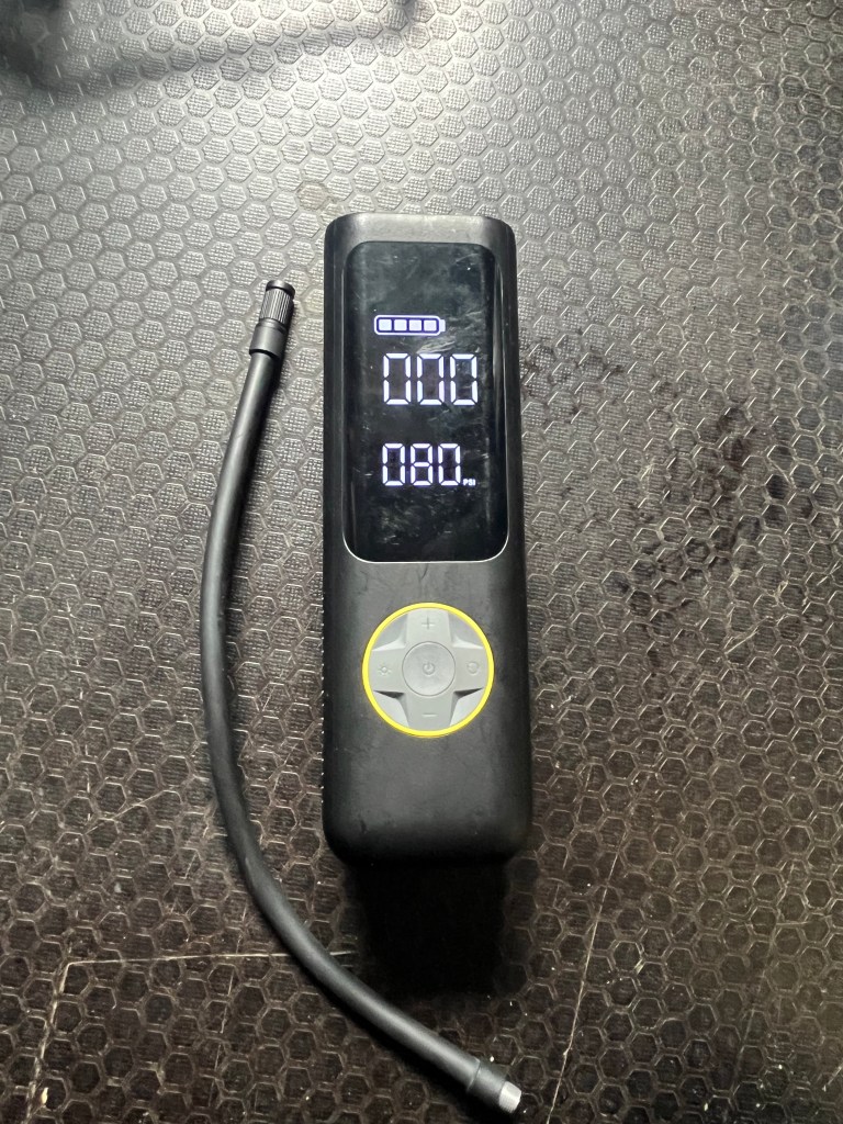 This powerful little air pump can inflate to well over the 80 psi that my rear tires require.
